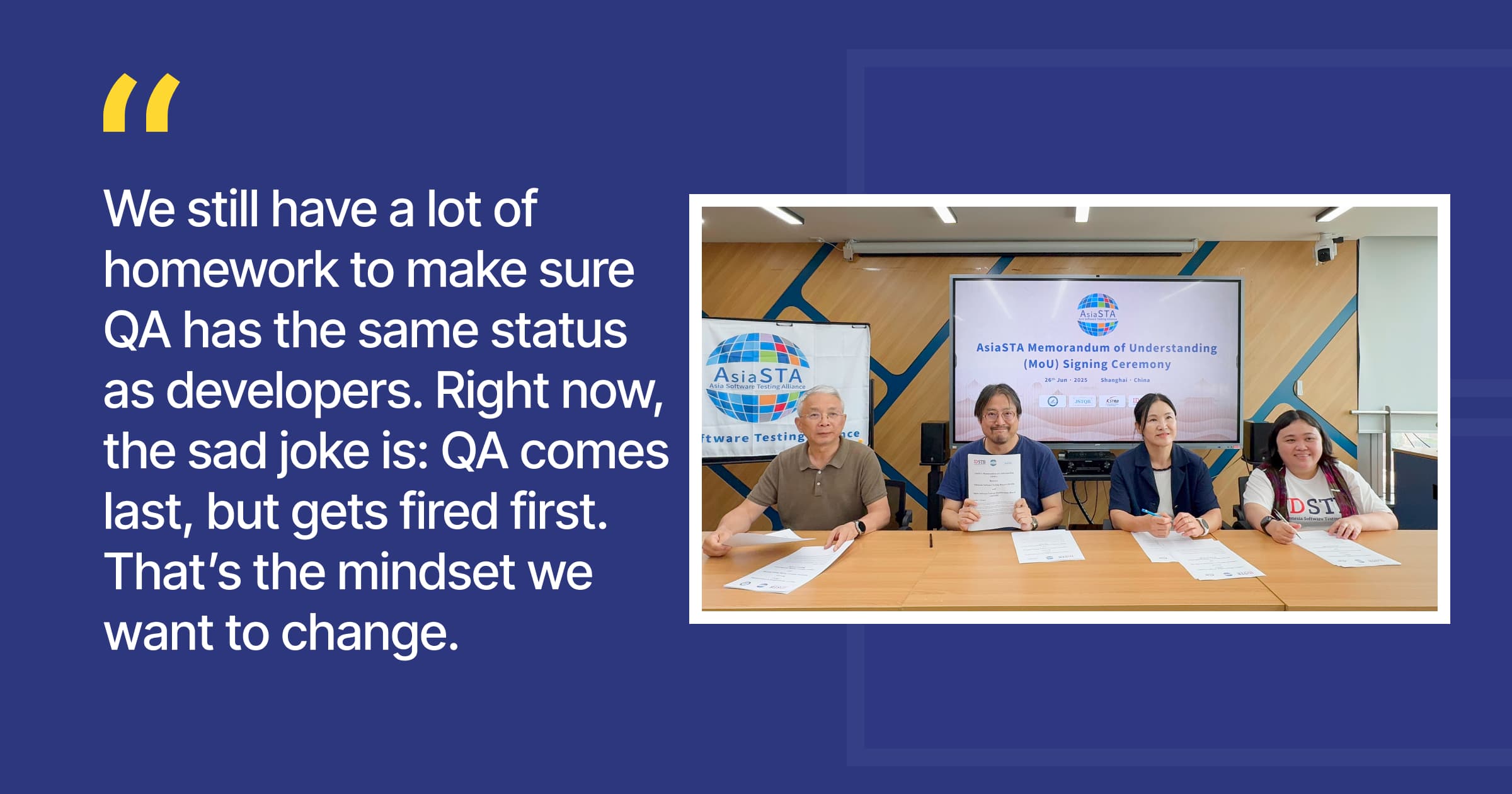 A: I’ve always loved gadgets and tech. When I lived in the US, I enjoyed trying out new devices. These days my focus has shifted to learning and leadership. I’m involved with international QA organizations like ISTQB and Asia Software Testing Alliance, and I also manage my own business outside of QA. I enjoy simulator games and traveling, which lets me meet people from different cultures and get inspired by them.